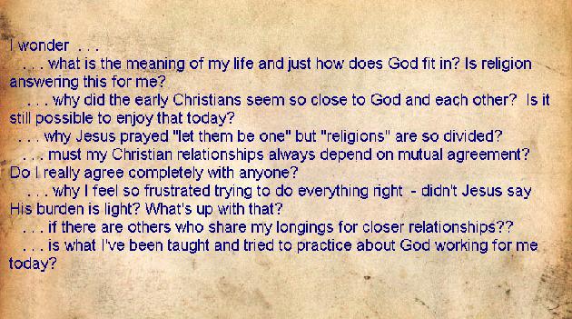 Asking such questions as those above kicked us in the seat of our britches and put us on a wild ride in which we now find ourselves outside the camp.*. We know we aren't the only ones. That's the reason for this web site. We want to share our journey and learn about God from yours. Please click the picture to the right to read a little about us and leave us an email about |