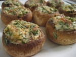 In heavy frying pan: Sauté until onion is translucent. Add 1 cup fine bread crumbs, mushroom stalks, chicken broth (enough to make a paste) Fill mushroom caps to mound. Cover with foil. Oven 425 - 25 to 35 minutes. |