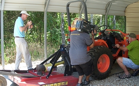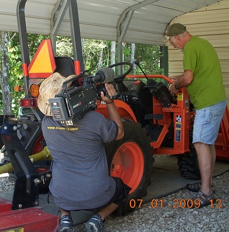 Next it was outside for some random shots. The day before we had taken various shots of Charlie riding a 4- wheeler - so they could show it at the beginning of the piece. Here's Alex is directing Charlie what to do around his tractor. Charlie said this was the hardest part - randomly doing things without talking.